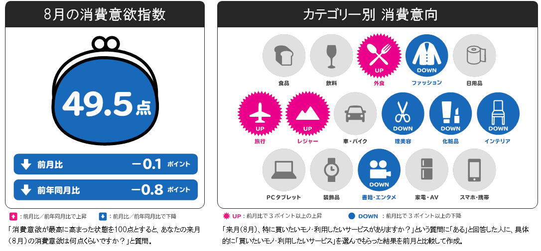 8月の消費意欲指数は49.5点。前月比-0.1ポイントで横ばい。前年同月比は-0.8ポイントで、8月としては過去最低値となり初めて50点を下回る結果となっています。