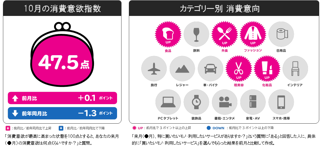 秋ならではの季節的消費意欲が伸びず。消費意欲指数は、前月から横ばいで47.5点となりました。