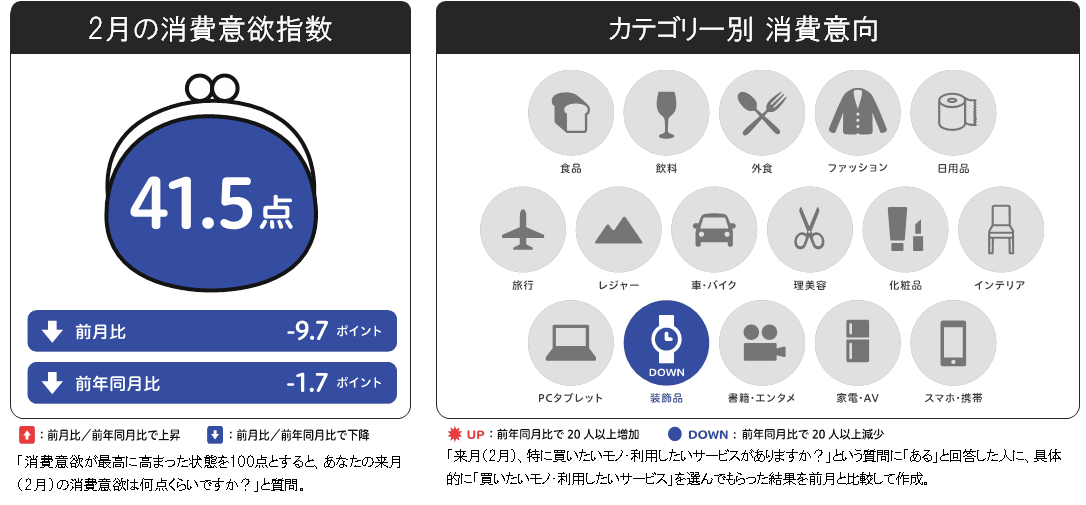 2月の消費意欲指数は41.5点で、前月比-9.7pt、前年同月比-1.7pt。前月比大幅ダウンで過去最低値を記録しました。