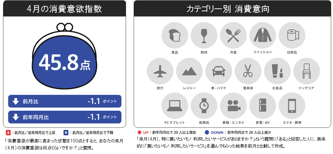 4月の消費意欲指数は45.8点。前年同月比・前月比ともに-1.1ポイントで、ほぼ横ばいとなりました。