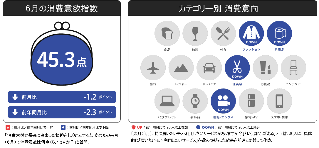 6月の消費意欲指数は45.3点。前月比は-1.2ポイントと横ばいですが、前年同月比は-2.3ポイントで、6月としては過去最低値となりました。