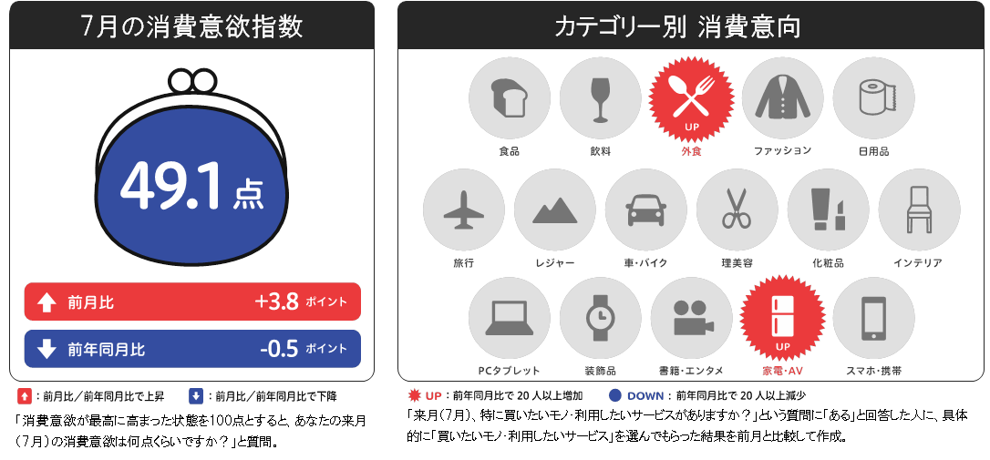 7月の消費意欲指数は49.1点で、前年同月比-0.5ポイント。6月の最低値となった前月から+3.8ポイント上昇しました。