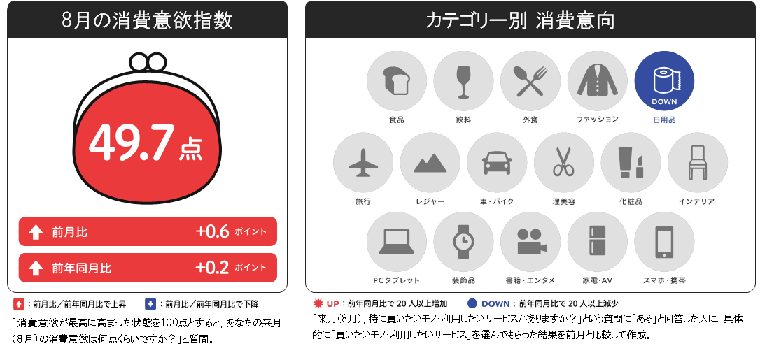 株式会社博報堂(本社・東京)のシンクタンク博報堂生活総合研究所は、20~69歳の男女1,500名を対象に「来月の消費意欲」を点数化してもらうなど、消費の先行きに関する調査を毎月実施。その結果を「来月の消費予報」として発表しています。8月の消費意欲指数は49.7点。前月比+0.6ポイント、前年同月比+0.2ポイントと、ほぼ横ばいとなりました。