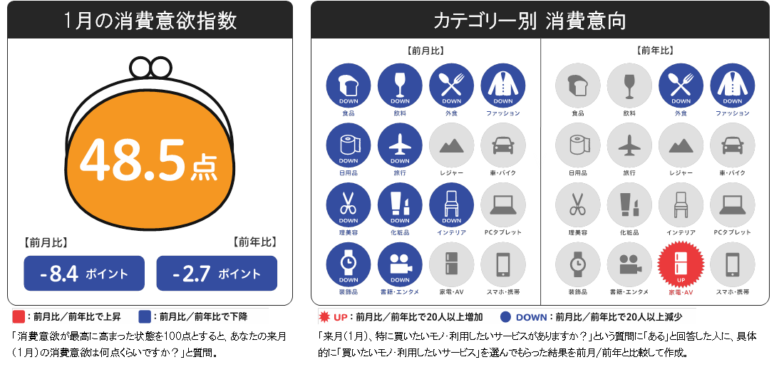 1月の消費意欲指数は48.5点。前月比-8.4ポイント、前年比-2.7ポイントで、1月としては過去最低値となりました。