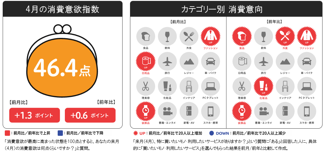 4月の消費意欲指数は46.4点。前月比+1.3ポイント、前年比+0.6ポイントとほぼ横ばいながら、1月から続いていた前年割れを脱却しました。