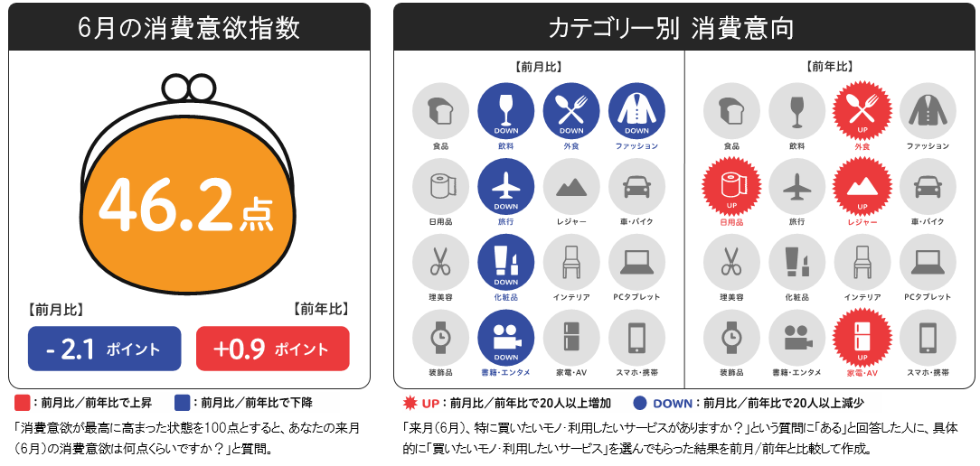 6月の消費意欲指数は46.2点。前月比-2.1ポイント、前年比+0.9ポイントと、前年から横ばいとなりました。