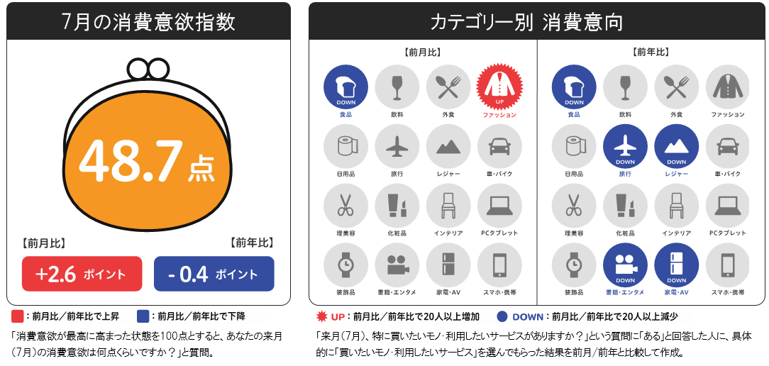 7月の消費意欲指数は48.7点。前月比+2.6ポイント、前年比-0.4ポイントと、前年からは横ばいとなりました。