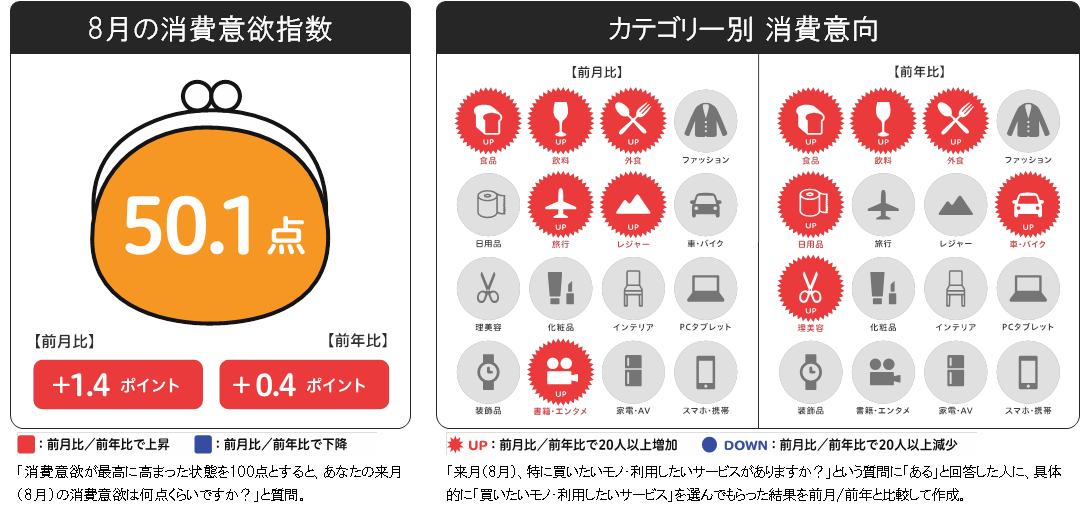 8月の消費意欲指数は50.1点。前月比+1.4ポイント、前年比+0.4ポイントと、ほぼ前年並みとなりました。