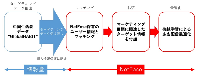 これは、博報堂グループが保有するGlobalHABIT*の中国生活者データを用いて抽出したターゲティングデータをNetEaseに受け渡し、NetEaseは機械学習を活用してリアルタイムに配信制御を行うことで、高い広告効果を生み出すものです。なお、受け渡すターゲティングデータは、個人情報保護に配慮した形で暗号化されます。