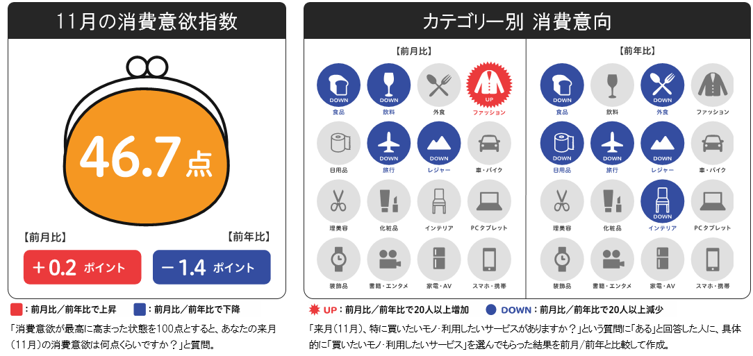 11月の消費意欲指数は46.7点。前月比+0.2ポイント、前年比-1.4ポイントと、前年からはマイナスとなりました。