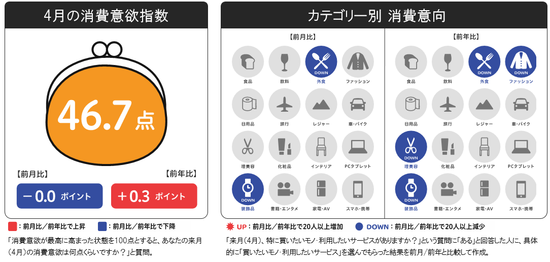 4月の消費意欲指数は46.7点。前月比-0.0ポイント、前年比+0.3ポイントと、前月比・前年比ともに横ばいとなりました。