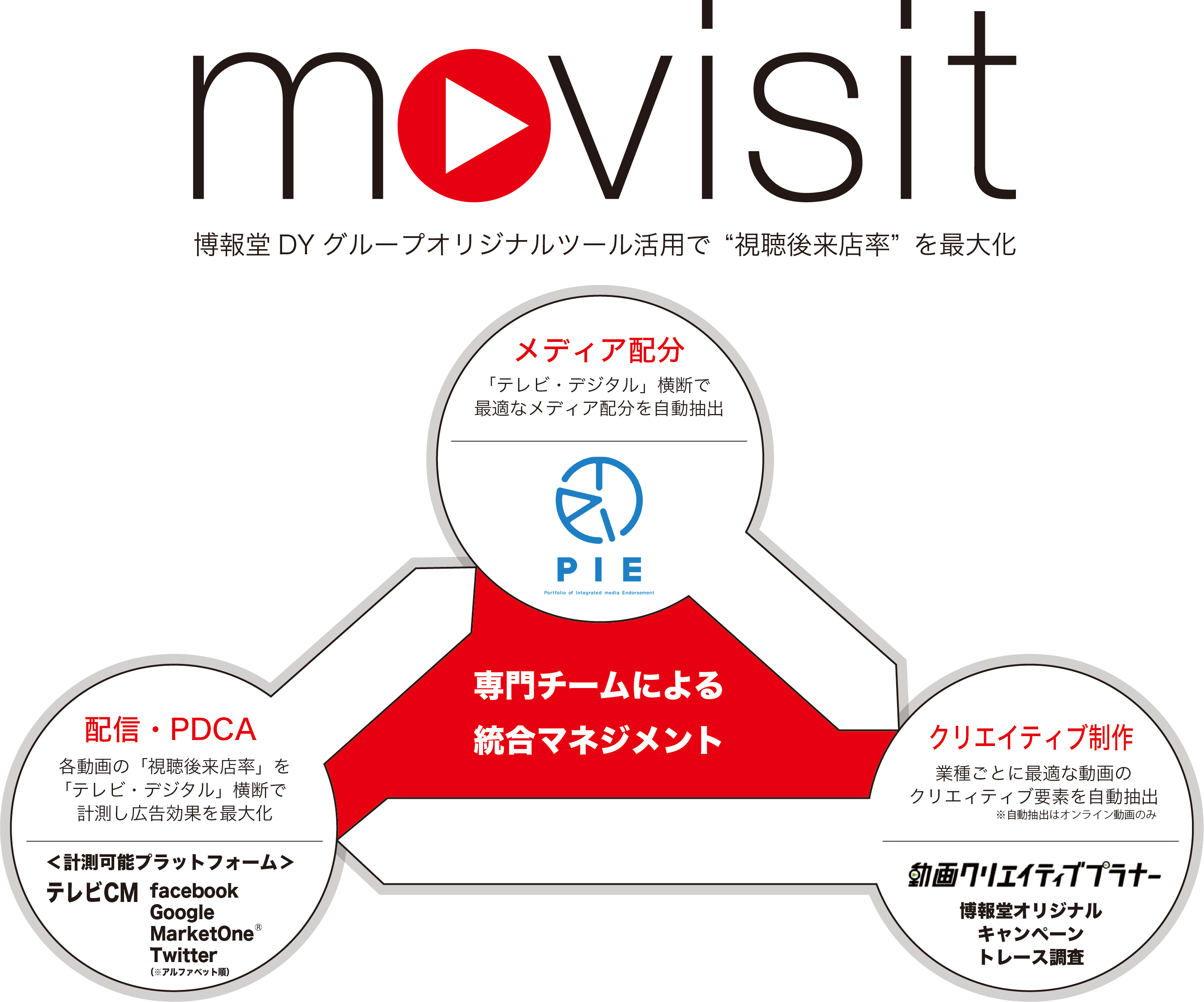 株式会社博報堂(東京都港区、代表取締役社長:水島 正幸)は、動画を使ったマーケティング効果の最大化を目指すプロジェクト「hakuhodo.movie(ハクホウドウ・ドット・ムービー)」の取組みの一環として、テレビCMとオンラインプラットフォームを横断した最適なメディアプラニングとクリエイティブプラニングで動画広告の「視聴後来店率」の最大化を目指す動画専門チーム「movisit(ムーヴィジット)」を始動いたします。