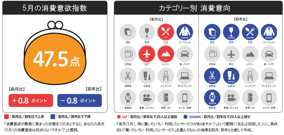 5月の消費意欲指数は47.5点。前月比+0.8ポイント、前年比-0.8ポイントと、前月比・前年比ともに横ばいとなりました。