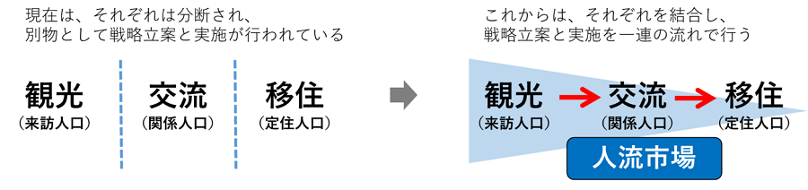 さらに、人の移動に関する調査研究を進めた結果、「観光」と「移住」は分断されたものではなく、「人流市場(じんりゅうしじょう)*」という一つの市場の中での一連の流れとして捉えられることが分かりました。