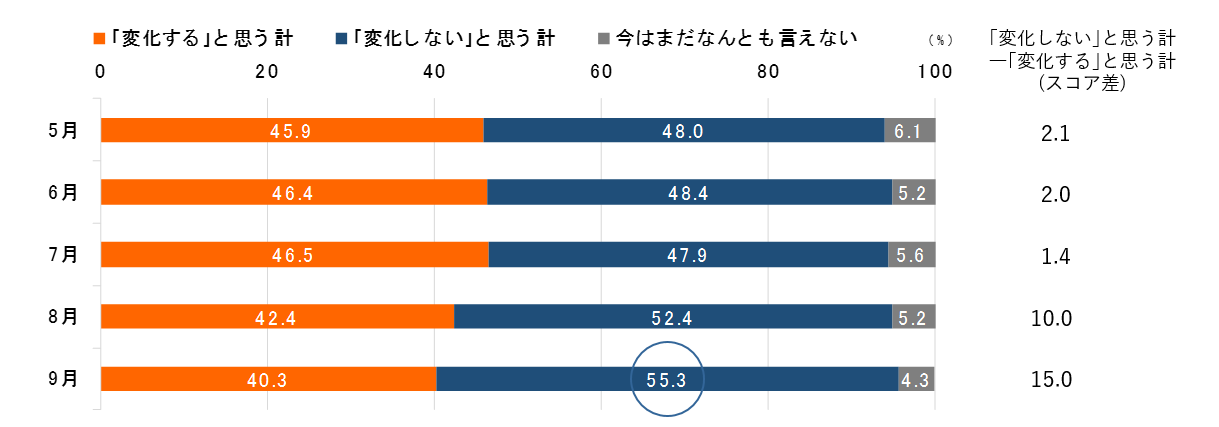 ・「変化する」と思う計との差も15.0ポイントにまで広がる。