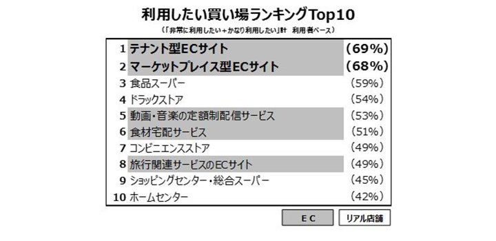 利用意向では、今回の調査で取り上げたECチャネルのうち、「テナント型ECサイト」や「マーケットプレイス型ECサイト」を筆頭にECの勢いを感じさせる結果となった。一方、「食品スーパー」や「ドラックストア」などのリアル店舗もTop10の半分を占めており、支持される様子が伺えた。