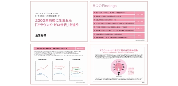 前回調査から今回までの5 年間は、リーマンショックや東日本大震災など、それまでに経験したことのない大きな出来事がありました。これらの出来事が、直接的、間接的に子供たちに与えたであろう影響を念頭におきながら、2000 年前後に生まれた「アラウンド・ゼロ世代」(1997 年4 月~2002 年3 月生まれ)の子供たちの特徴を、15 年間の生活変化をもとに、8つの観点から浮き彫りにしました。