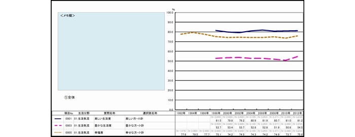 今回の一般公開では、過去20 年分の回答値を全体・性年代別・地区別に一覧できる数表(集計データ)と、時系列グラフを自動で簡単に作成できるプログラムを、広く社会の皆様に向けて無償でご提供します。数表とプログラムは、生活総研のウェブサイト(http://seikatsusoken.jp/)から、いつでもどなたでも自由にダウンロードしてお使い頂けます。利用者登録などの必要は一切ありません。