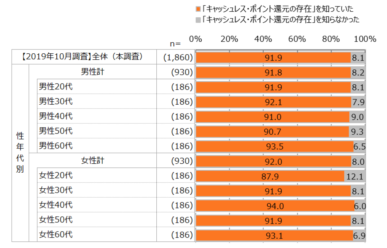 - 還元事業の認知率は調査対象者の91.9%。各年代、性別においてもほぼ同様のスコアとなりました。