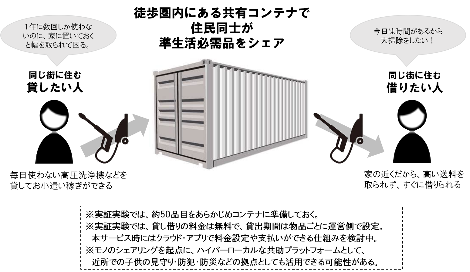 当社が住友商事とともに開発を進めている今回のシェアリングサービスは、半径数km圏内の近所で暮らす住民同士のモノのシェア(貸し借り)をサポートするサービスです。シェアの拠点として、街中の公園や空き地などのパブリックスペースや、団地やマンションの共用部などに、実際の物品を収容した共有コンテナを設置。レジャー用品や電動工具、旅行用品など、時々使えると便利だが個人で常備しておくほどではない、いわば“準生活必需品”と言える物品を街やコミュニティが所有して貸し出したり、住民同士で貸し借りして活用していくことで、住民間の交流や共助を生み、コミュニティの活性化につなげることを狙いとしています。