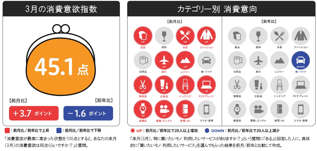3月の消費意欲指数は45.1点。前月比+3.7ポイントと、前月からは回復しましたが、前年比は-1.6ポイントとなりました。
