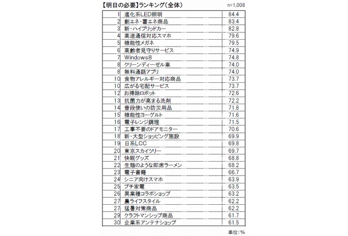 エネルギー不安が恒常化する中、次の生活インフラとなり得る商品。進化系LED照明(1位)、創エネ・蓄エネ商品(2位)、新・ハイブリッドカー(3位)、クリーンディーゼル車(8位)が支持されました。