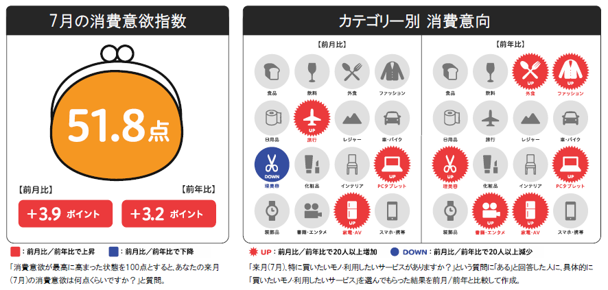 消費意欲指数は、7月としては5年ぶりの50点台。 今年の最高値も更新。