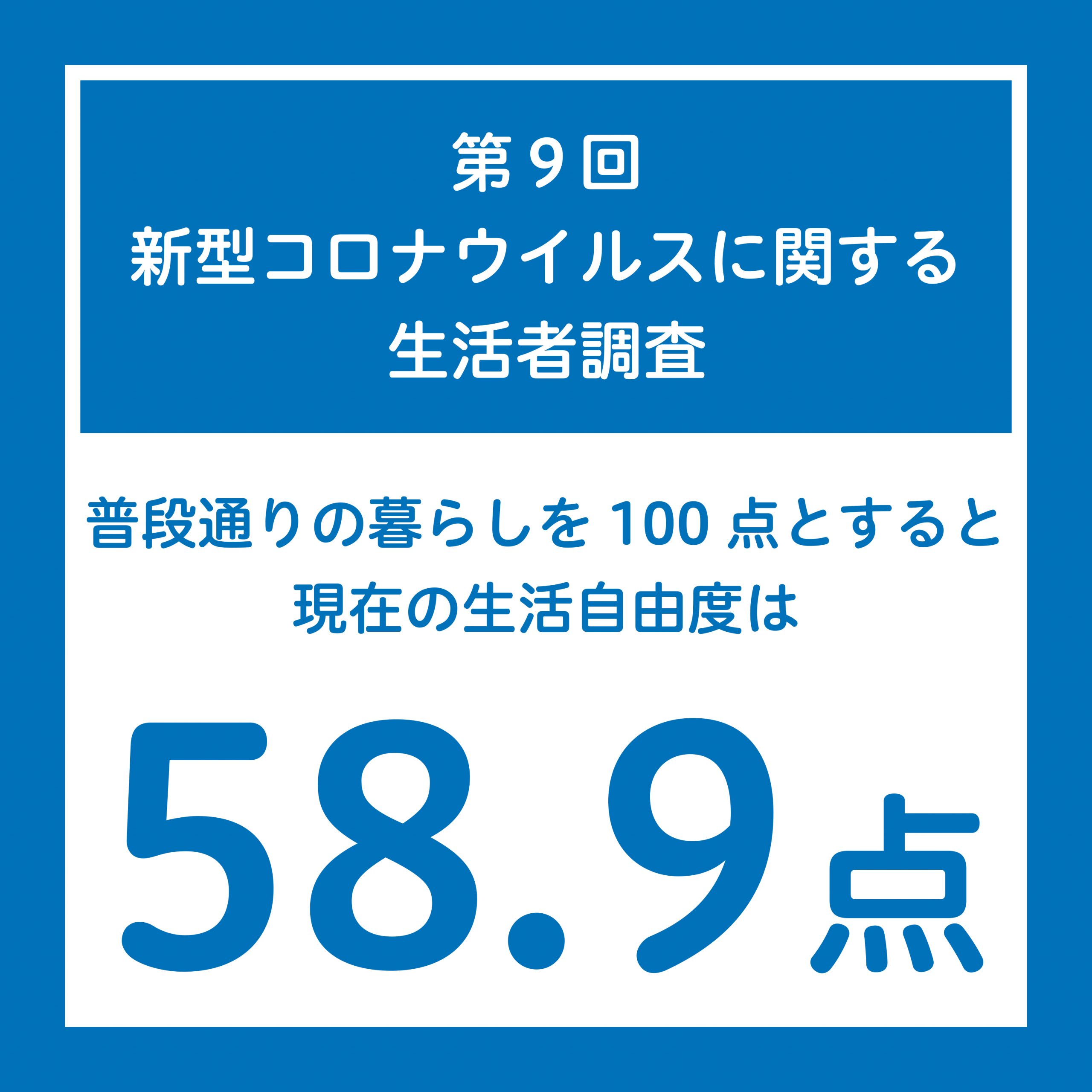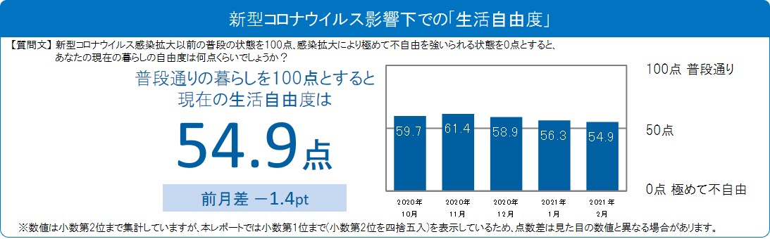感染拡大以前の普段の状態を100点としたとき、現在の状況下における「生活自由度」が何点くらいかをきいたところ、54.9点と、1月からは1.4ポイント減少。3か月連続で減少となりました。