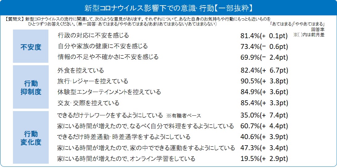 【行動変化度】では、「できるだけテレワークをするようにしている」(35.0%、7.4pt増、有職者ベース)が大きく増加。「できるだけ時差通勤・時差通学をしている」(40.6%、3.9pt増)も増えるなど、出勤・通学の調整が目立ちます。また「家にいる時間が増えたので、なるべく自分で料理をするようにしている」(60.7%、4.4pt増)、「家にいる時間が増えたので、家の中でできる運動をするようにしている」(47.3%、3.4pt増)、「家にいる時間が増えたので、オンライン学習をしている」(19.5%、2.9pt増)など、家の中での行動に関する項目が増加しています。