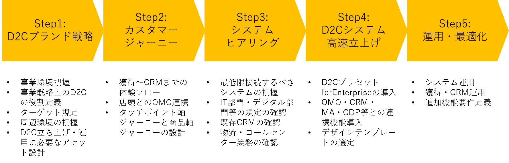 数年に渡る当社独自の取り組みを通じて得た、大企業がD2Cブランドビジネスを立ち上げる際に必要なビジネス視点・デザイン視点・システム視点を組み込んだオリジナルパッケージ「D2Cプリセット For Enterprise」を通じて、複雑な要件定義の手間を削減
