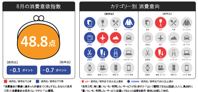 夏休みや帰省シーズンを迎える8月は、例年消費意欲指数が高くなる月ですが、今年の48.8点は前月から-0.1ptの横ばい、前年比では-0.7ptとやや低下しており、8月としては過去5年の最低値となりました。