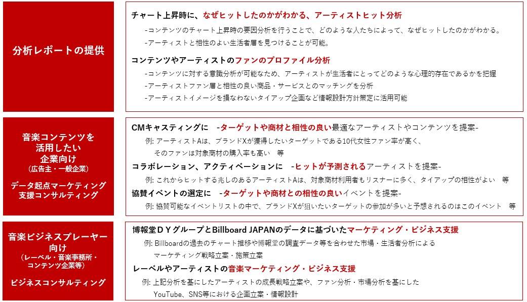 音楽コンテンツを活用したい一般企業や音楽ビジネスプレーヤーを対象に、アーティスト、市場、生活者などのデータを起点とする多面的な分析を基にした今までにない分析レポート作成のほか、アクティベーション企画や協賛イベント選定などのマーケティング支援、コンサルティングサービスを行ってまいります。