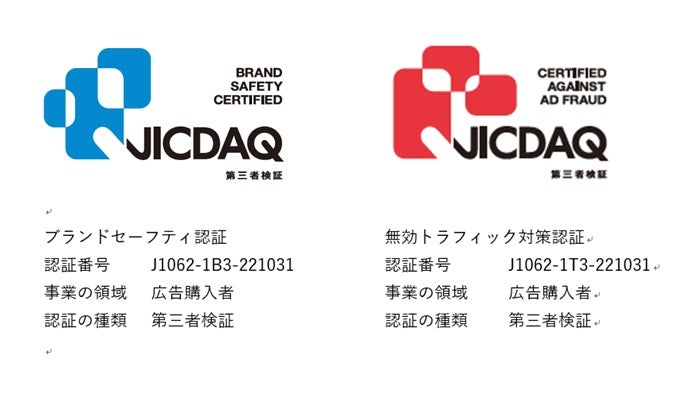 JICDAQは、デジタル広告の品質確保に関する取り組みを推進し、デジタル広告市場の健全な発展を目指す認証機構で、公益社団法人 日本アドバタイザーズ協会、一般社団法人 日本広告業協会、一般社団法人日本インタラクティブ広告協会の広告関係3団体により、2021年3月に設立されました。インターネット広告の品質課題のうち、JICDAQは、「広告掲載先品質に伴うブランドセーフティの確保(明らかに違法・不当な広告掲載先の排除)」と「アドフラウドを含む無効トラフィックの除外(“人”に届いていない広告配信の排除)」を品質認証の対象としており、事業者の業務プロセスの有効性を検証し、一定の基準をクリアした事業者を11月より公表しています。