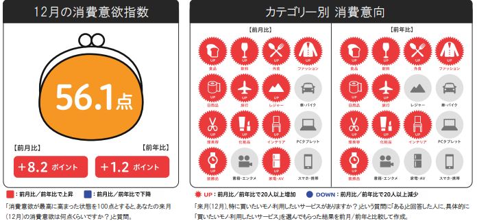2021年12月の消費意欲指数は56.1点。前月比+8.2pt、前年比+1.2ptと、ともに増加しました。