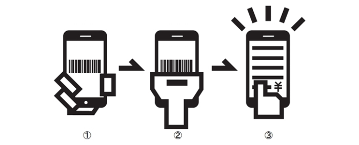 (スマートフォン、フィーチャーフォン対応)(1)買物客は、電子レシートシステム(の専用サイト)に事前登録して生成しておいた「マイバーコードの携帯端末画面を、電子レシート対応店舗でのPOSレジ精算時に呈示。