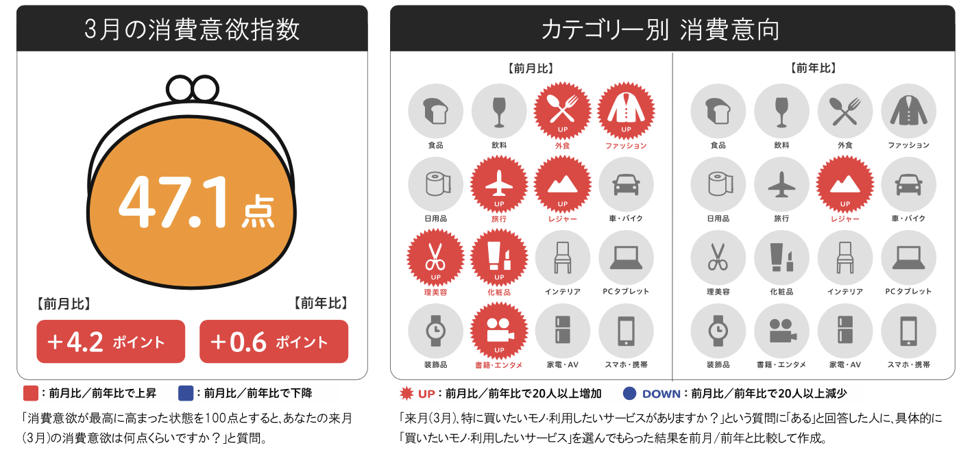 3月の消費意欲指数は47.1点。前月比は+4.2ptの上昇、前年比では+0.6ptの微増となりました。