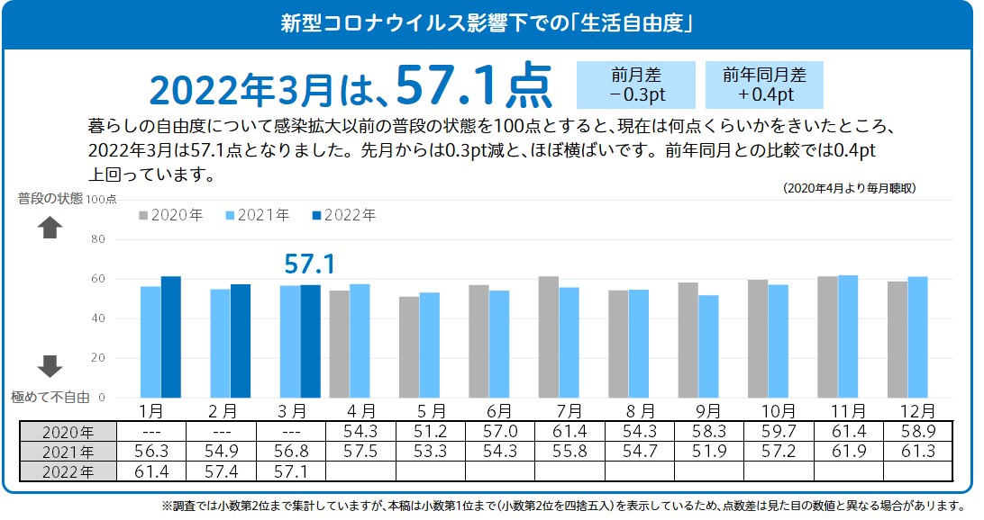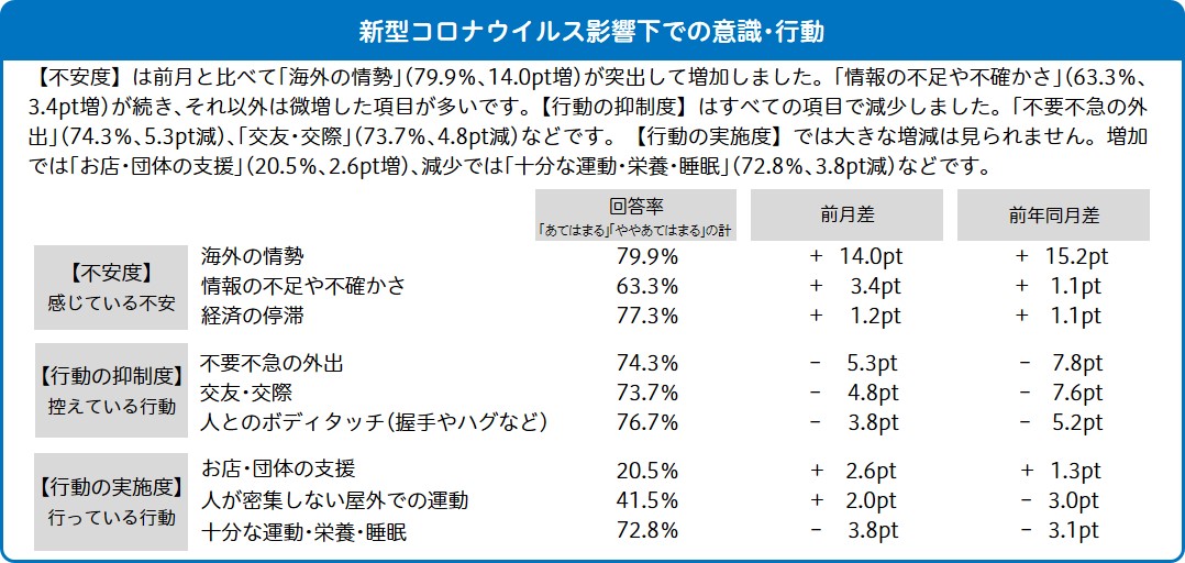 【調査前の状況】2月初めに34県が対象だった「まん延防止等重点措置」は、中旬に山口県など一部で解除されたものの、首都圏・関西圏・中京圏を含む各都道府県では2度延長され3月21日まで継続。2月1日に1日10万人を超えた新規感染者数は、2月下旬に緩やかに減少を始めるも、3回目のワクチン接種率は2月末で対象者の約2割にとどまり、高齢者を中心に死者数も増加傾向をみせ、医療のひっ迫も続きました。月末にはロシアによるウクライナ侵攻の報道が始まり、そちらへの関心が高まる中での調査です。