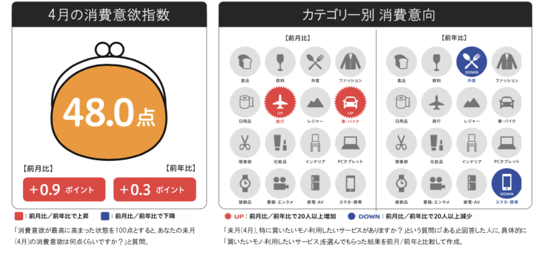 4月の消費意欲指数は48.0点。前月比は+0.9ptの微増、前年比では+0.3ptとほぼ横ばいとなりました。