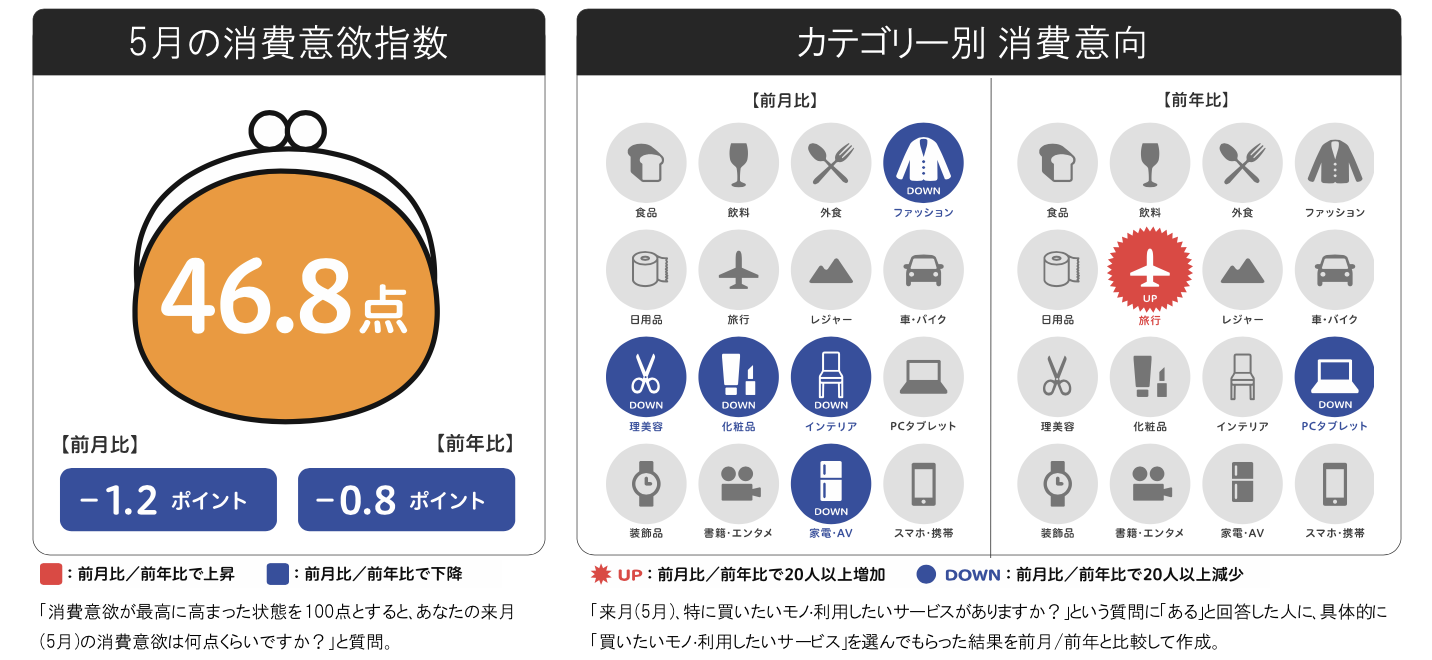 5月の消費意欲指数は46.8点。前月比-1.2ptの低下、前年比では-0.8ptの微減となりました。