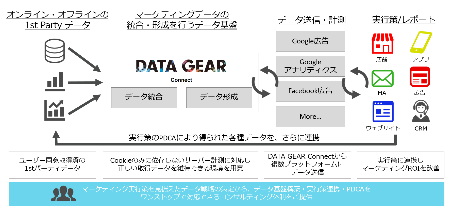 この課題解決のため、博報堂DYグループ開発による1st Partyデータ計測基盤を中核に、クライアント企業のマーケティング活動に合わせて、マーケティング実行策を見据えたデータ戦略策定から、データ基盤構築・実行策連携・改善PDCAのコンサルティングをワンストップで行うのが「DATA GEAR Connect」です。