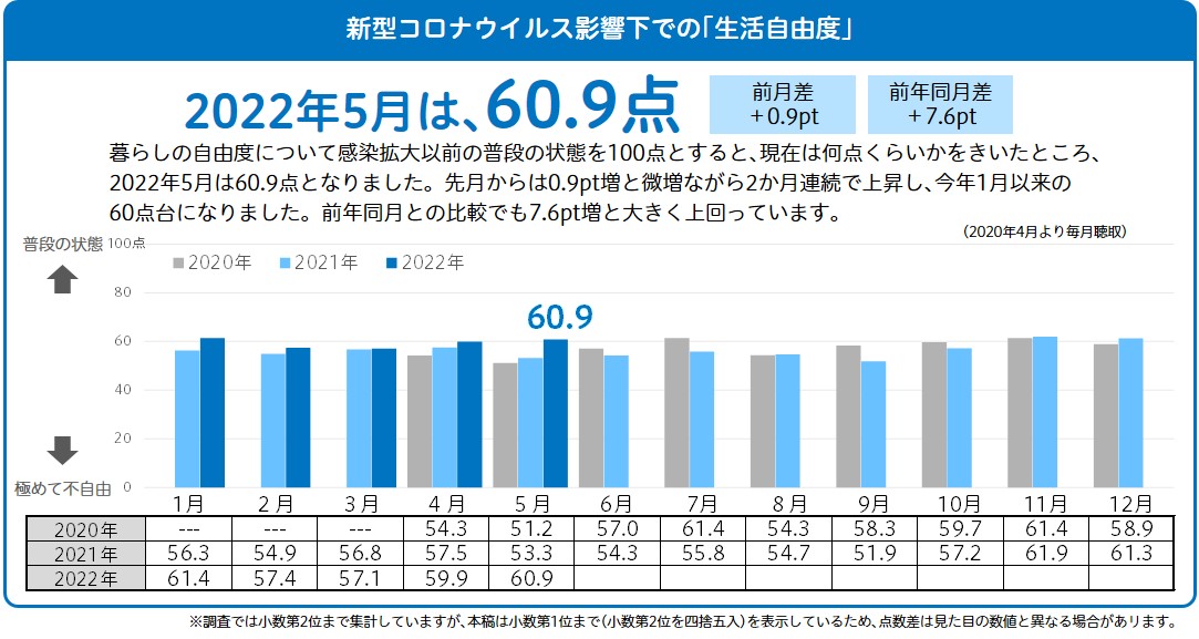 【調査前の状況】3月21日にまん延防止等重点措置が全面解除された後、新型コロナウイルスの新規感染者数は、4月上旬に増加の兆しをみせましたが、その後は、全国的にも東京や大阪など大都市圏でも減少傾向が続きました。ただし、4月下旬になると過去最多を更新した自治体も出現し、地域差もみられる状況となりました。その中で3年ぶりに緊急事態宣言などの行動制限が一切ないゴールデンウィークがスタート。繁華街や観光地が人出で賑わっているとの報道がなされていた中での調査です。