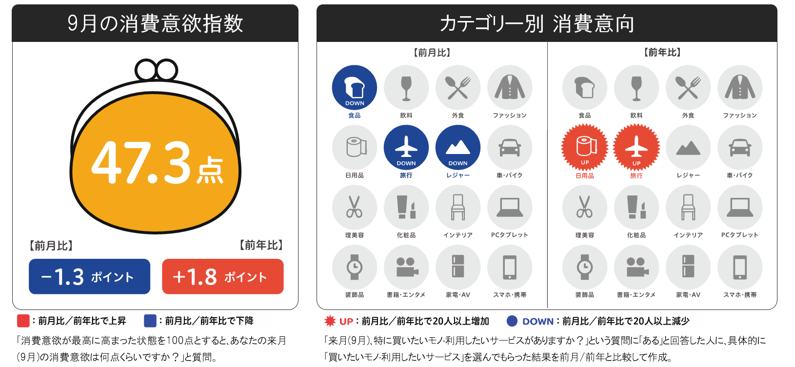 例年9月は、夏休みや帰省シーズンの8月に比べて消費意欲指数が低下する月です。今年も8月から-1.3pt低下しましたが、前年9月と比べると+1.8ptの上昇となりました。