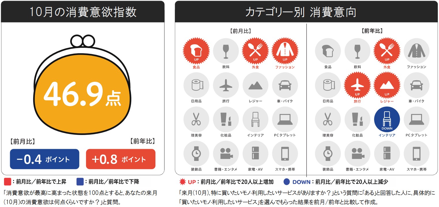 例年10月の消費意欲指数は、前月と同水準で推移することが多く、今年も前月から-0.4ptの横ばいで、前年からは+0.8ptの微増となりました。