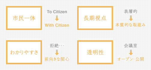 - 結論が出てから情報を提供する一方通行のコミュニケーションではなく、関連するステークホルダーや地域市民が一体となって解決策を導く仕組みをつくります。