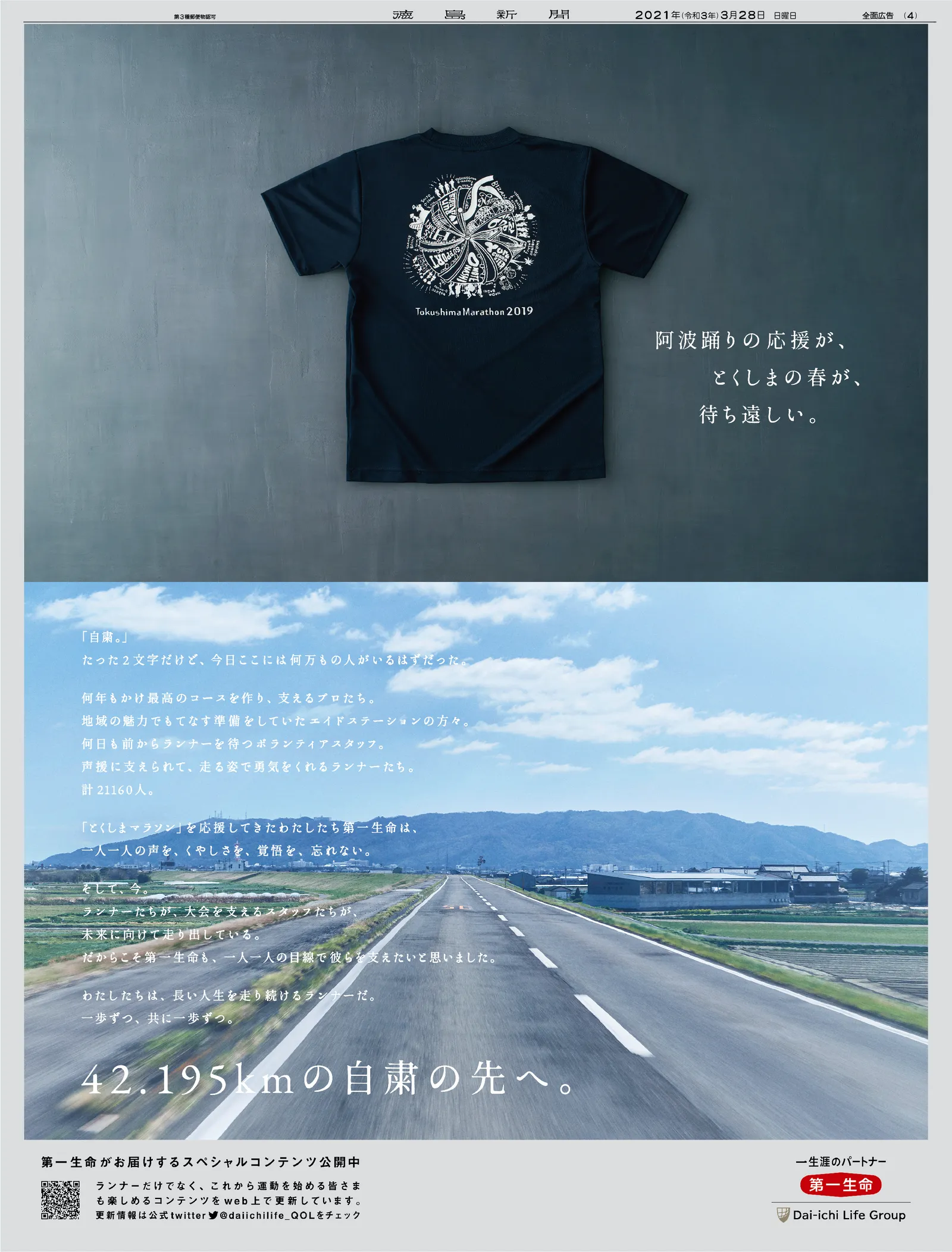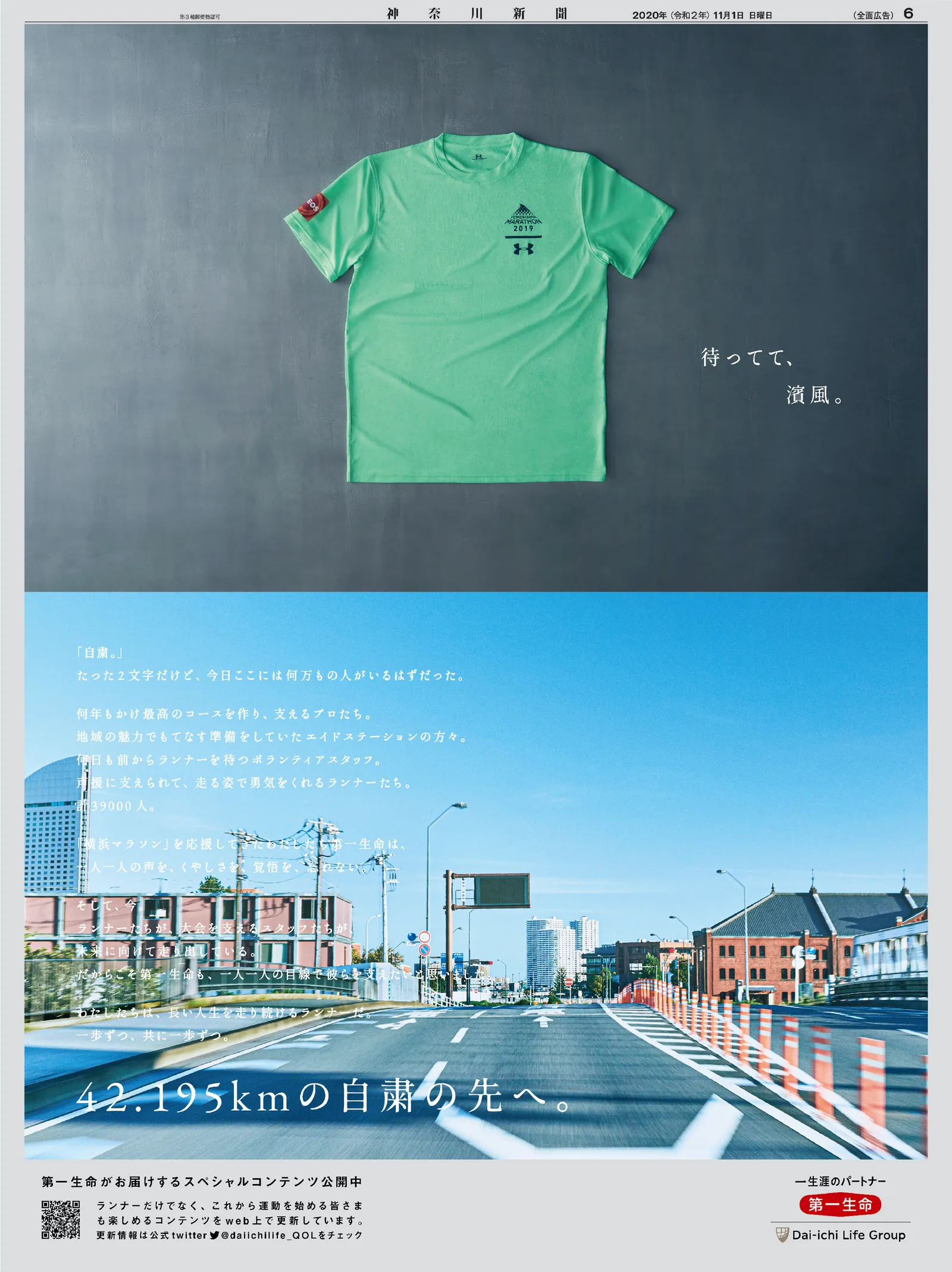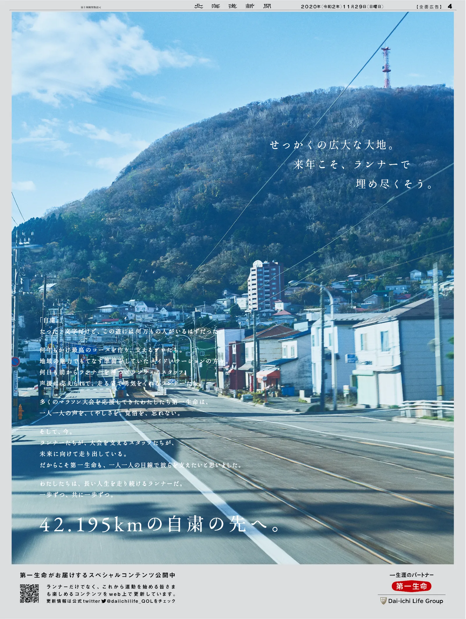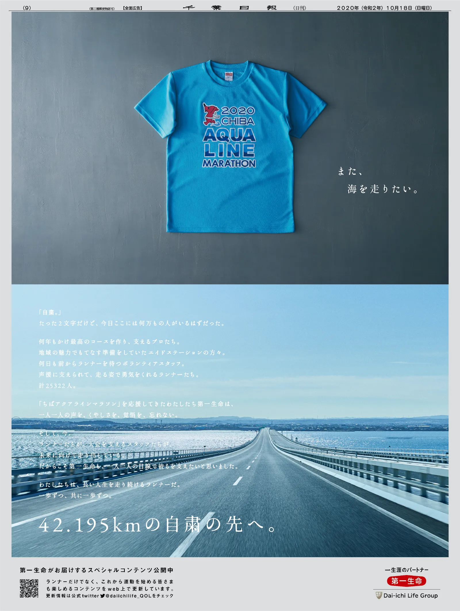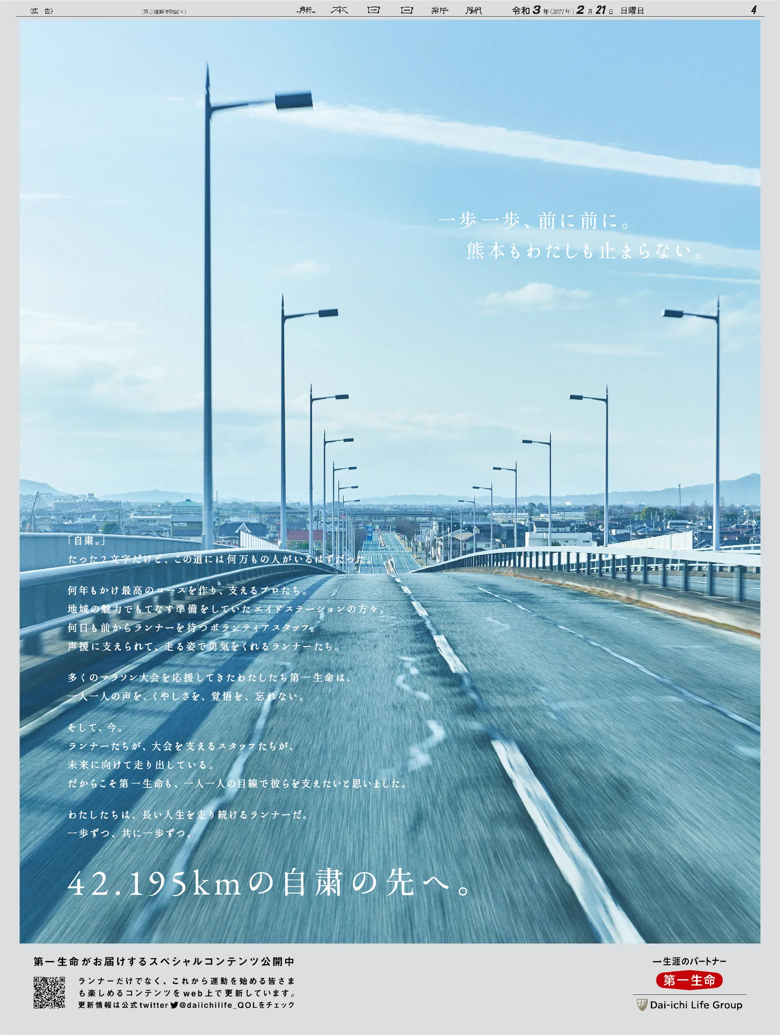 長年、全国の市民マラソン大会を応援してきた第一生命。<br>しかし、2020年度、大会がコロナ禍で軒並み中止/延期に。<br>マラソン関係者を支える存在としてのアクションを、みんなが前向きになれるメッセージとして、大会中止日に新聞を通して掲出しました。