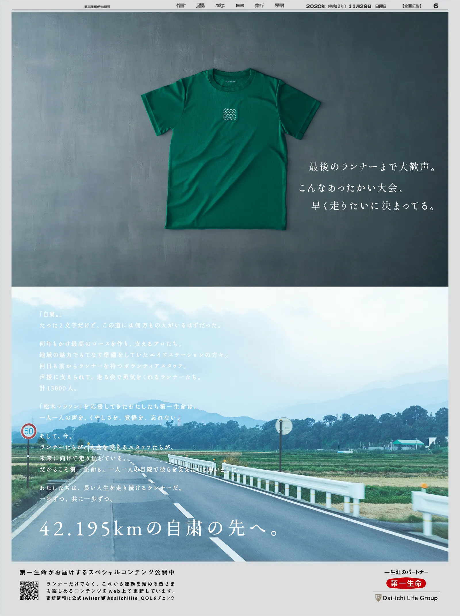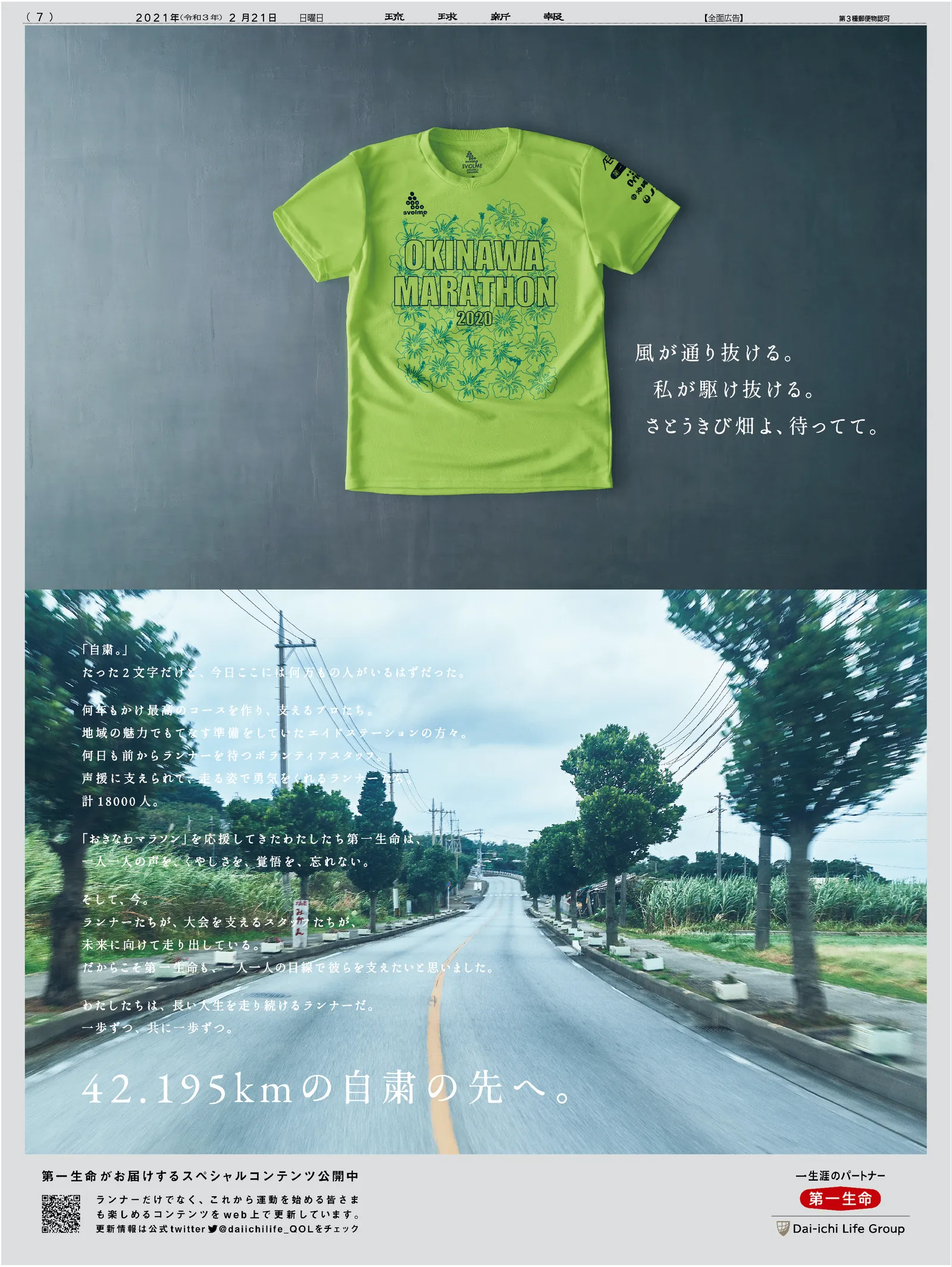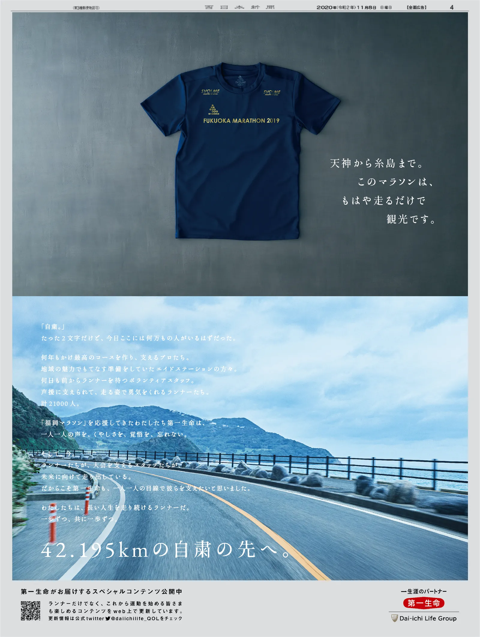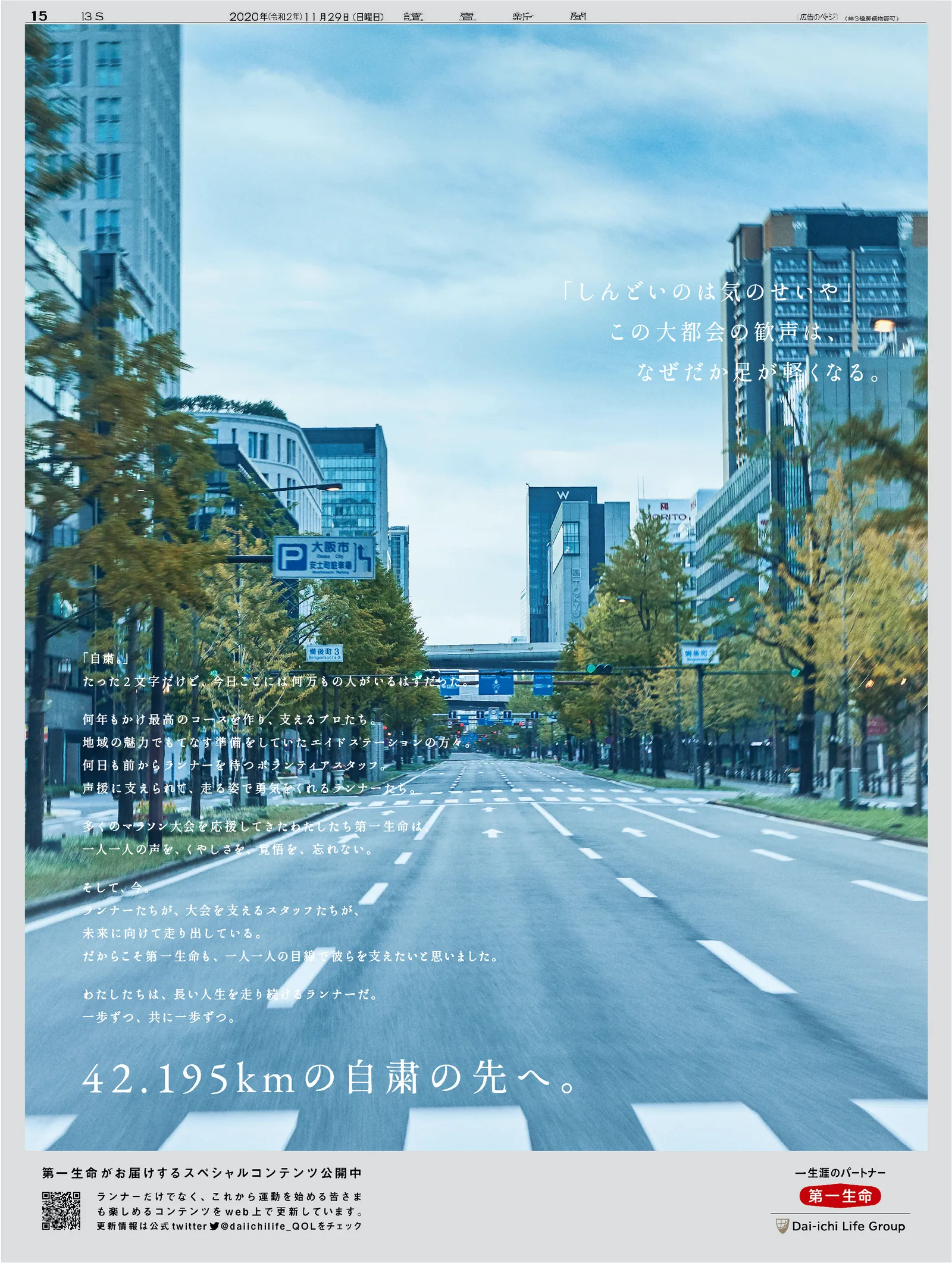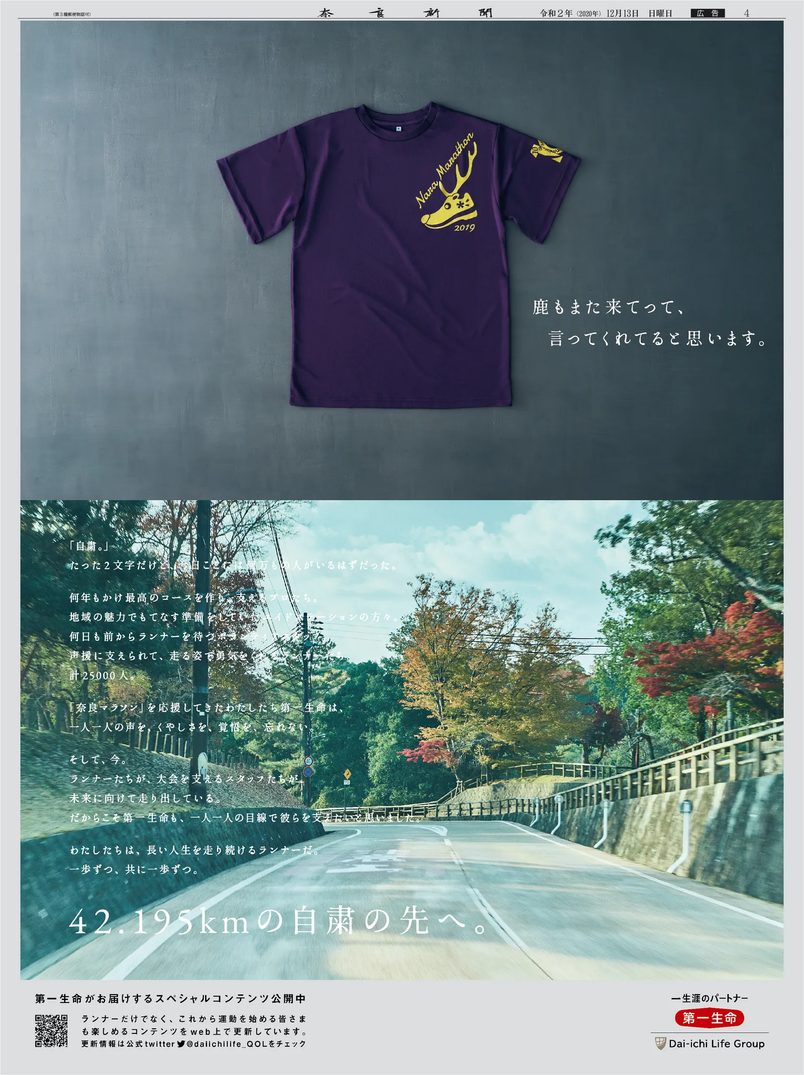 長年、全国の市民マラソン大会を応援してきた第一生命。<br>しかし、2020年度、大会がコロナ禍で軒並み中止/延期に。<br>マラソン関係者を支える存在としてのアクションを、みんなが前向きになれるメッセージとして、大会中止日に新聞を通して掲出しました。