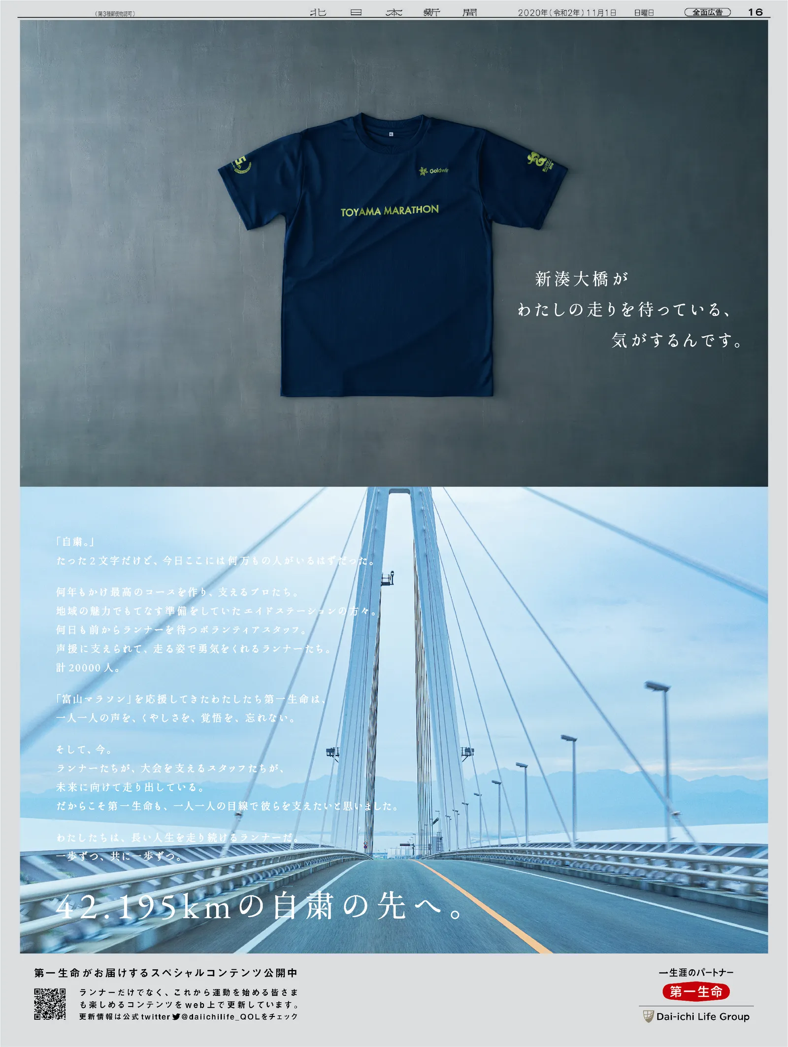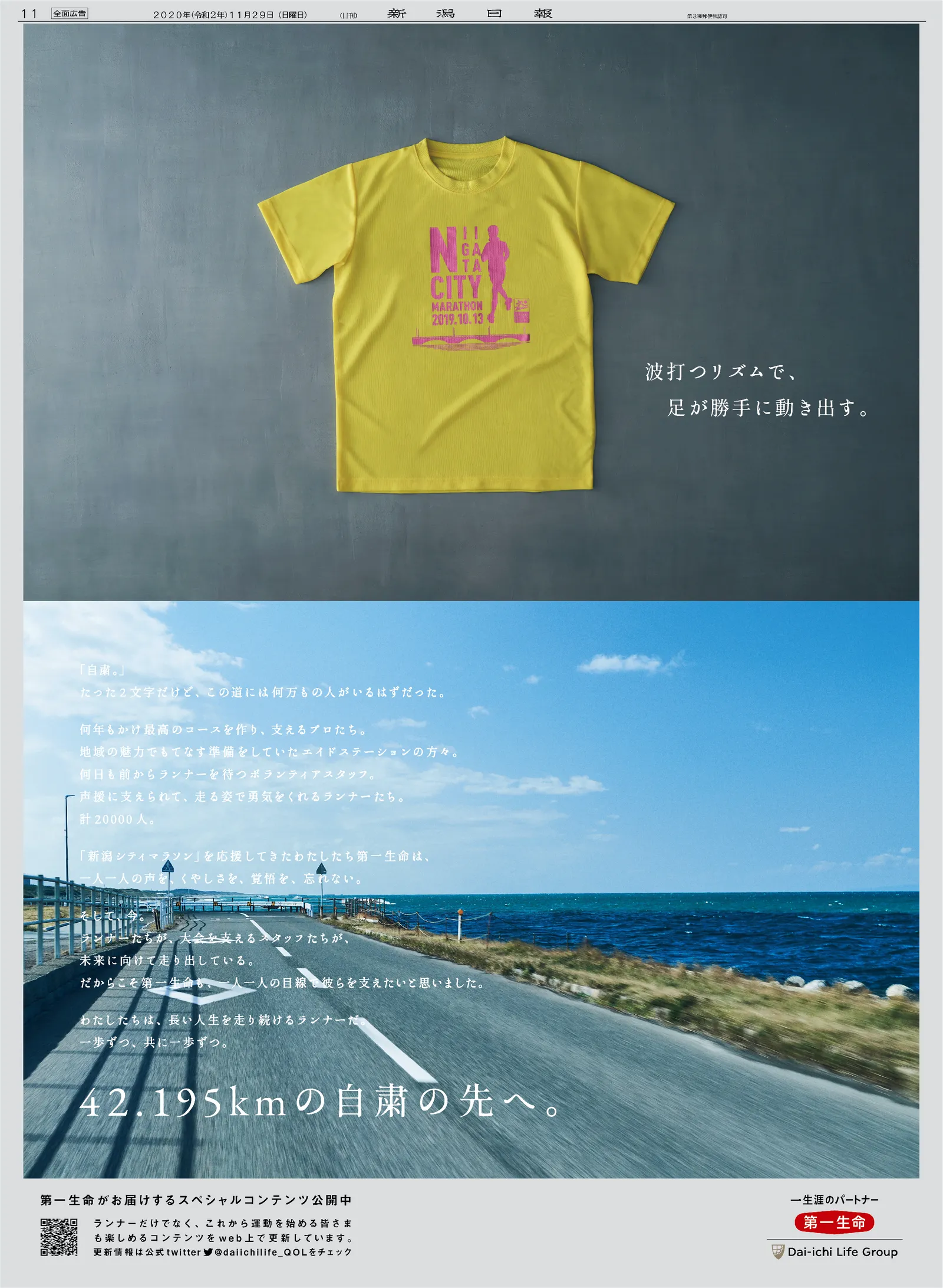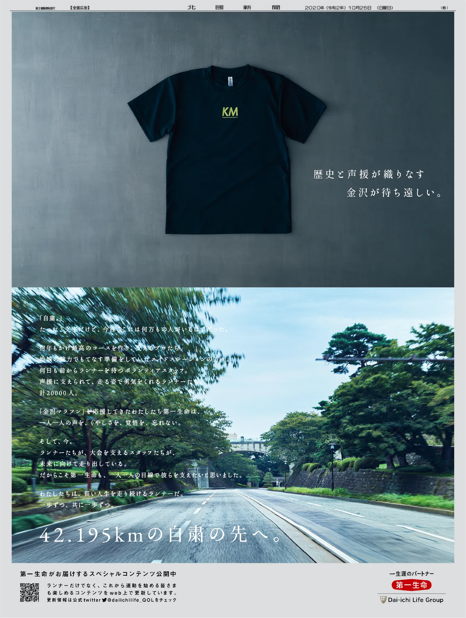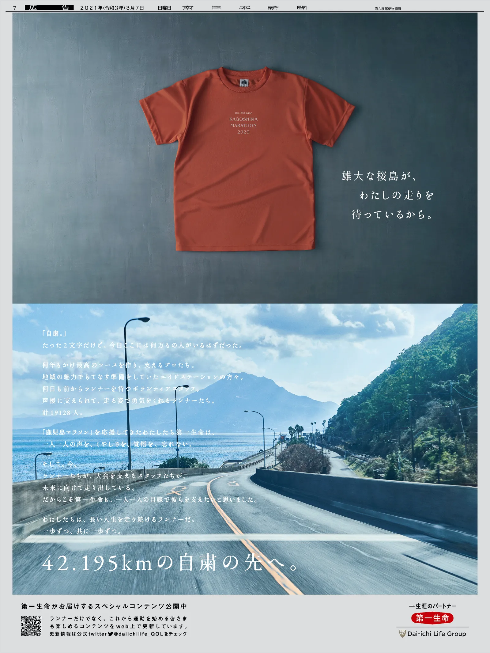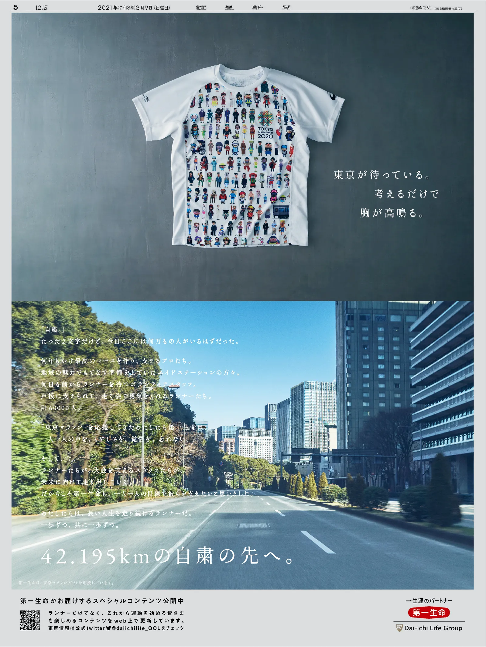 長年、全国の市民マラソン大会を応援してきた第一生命。<br>しかし、2020年度、大会がコロナ禍で軒並み中止/延期に。<br>マラソン関係者を支える存在としてのアクションを、みんなが前向きになれるメッセージとして、大会中止日に新聞を通して掲出しました。